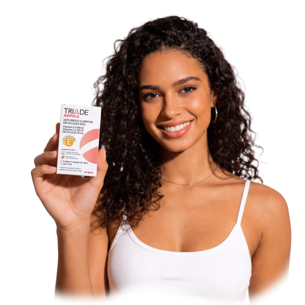 O Tríade Ampola oferece várias vantagens para a saúde da pele, cabelo e ossos devido à sua fórmula combinada de vitaminas A, D e E. A vitamina A auxilia na manutenção da visão, saúde da pele e sistema imune, enquanto a vitamina D é essencial para a saúde óssea, absorção de cálcio e fósforo, além de fortalecer o sistema imune. Já a vitamina E atua como um poderoso antioxidante, protegendo contra danos celulares que aceleram o envelhecimento e estão associados a doenças cardiovasculares e inflamatórias. ¹
